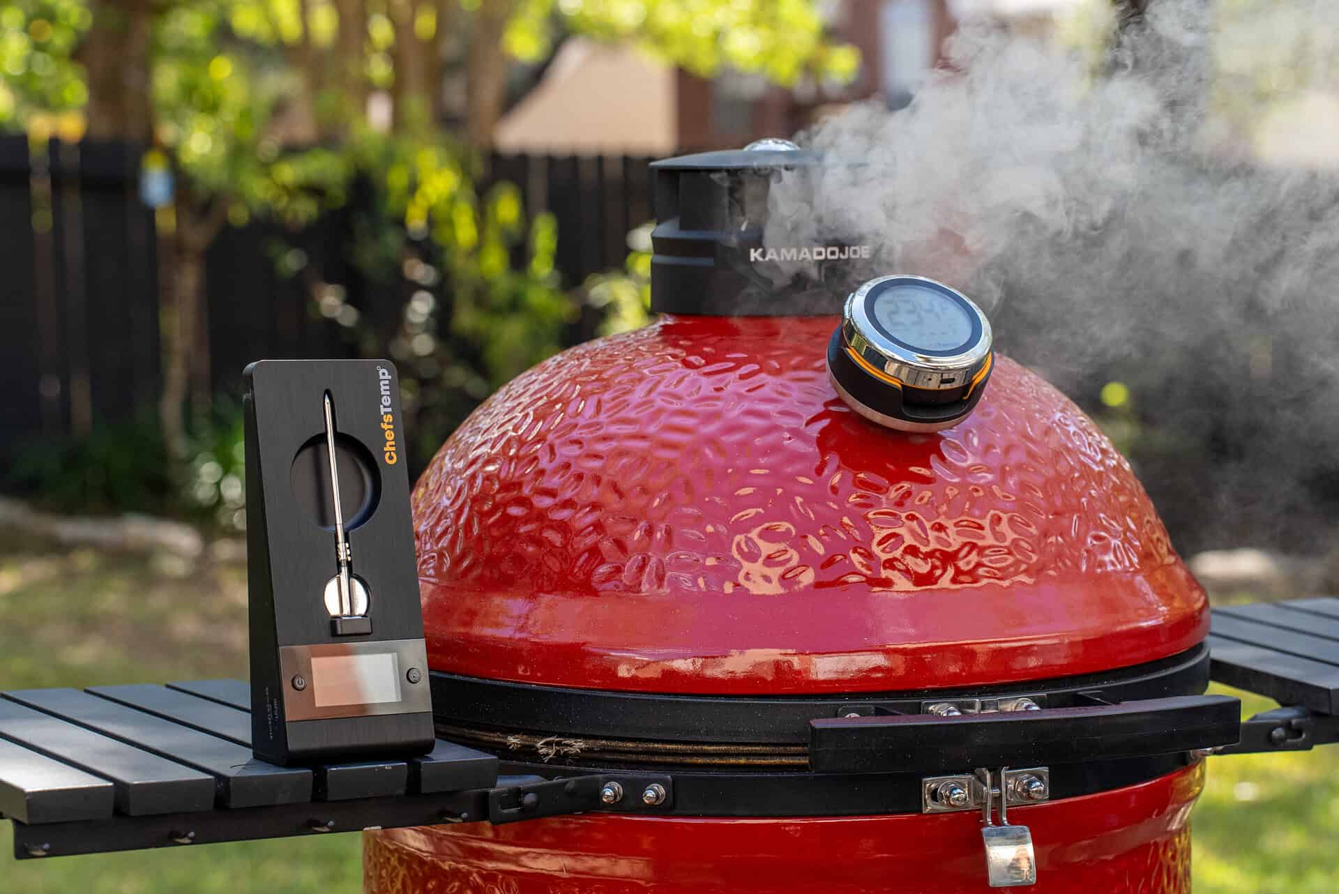 Wireless thermometer on a red ceramic grill with lock-in temperature display for perfect grilling.
