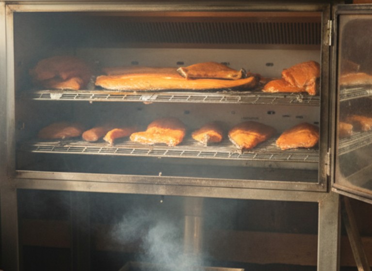 Golden, flaky, and full of flavor: Our signature salmon fillets undergoing a slow, wood-fired smoking process.