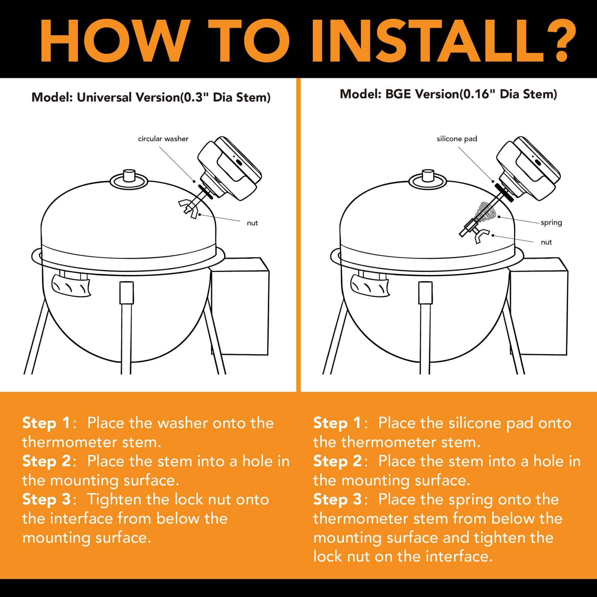 • Please measure the diameter of your grill's existing thermometer port to ensure the best fit. If the hole is 7.8 mm (0.3 inches) or larger, the Universal Version is suitable. For smaller holes, such as those on a Big Green Egg, choose the BGE Version.