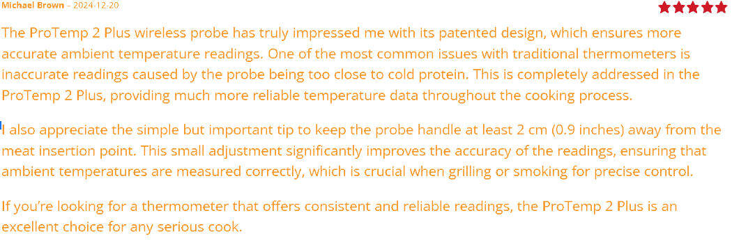 In a review from December 20, 2024, Michael Brown praised the ProTemp 2 Plus probes, noting an increase in accuracy in ambient temperature readings due to reduced cold-meat interference. He also noted that, for more accurate and consistent readings while grilling and smoking, the probe handle should be slightly away from the insertion point.