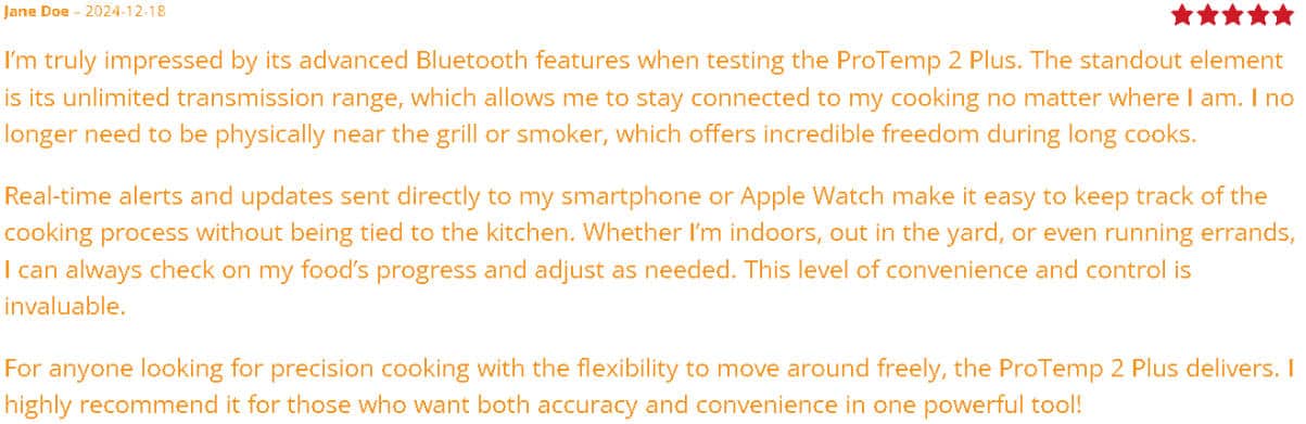 On December 18, 2024, user Jane Doe posted a review on an online product review site describing her experience using the ProTemp 2 Plus. She praised its exceptional wireless connectivity, even during prolonged use. She explained that the device sustained a consistent wireless connection while she monitored the cooking progress through alerts on her phone and Apple Watch. She stated that the wireless connection allowed her to step away from the grill or smoker, reducing the need to physically monitor the cooking. This feature, she explained, was especially beneficial during multiple-hour cooking smokes, while she completed other tasks. This review reinforced the ProTemp 2 Plus wireless remote’s ability to handle longer, more involved cooking processes.
